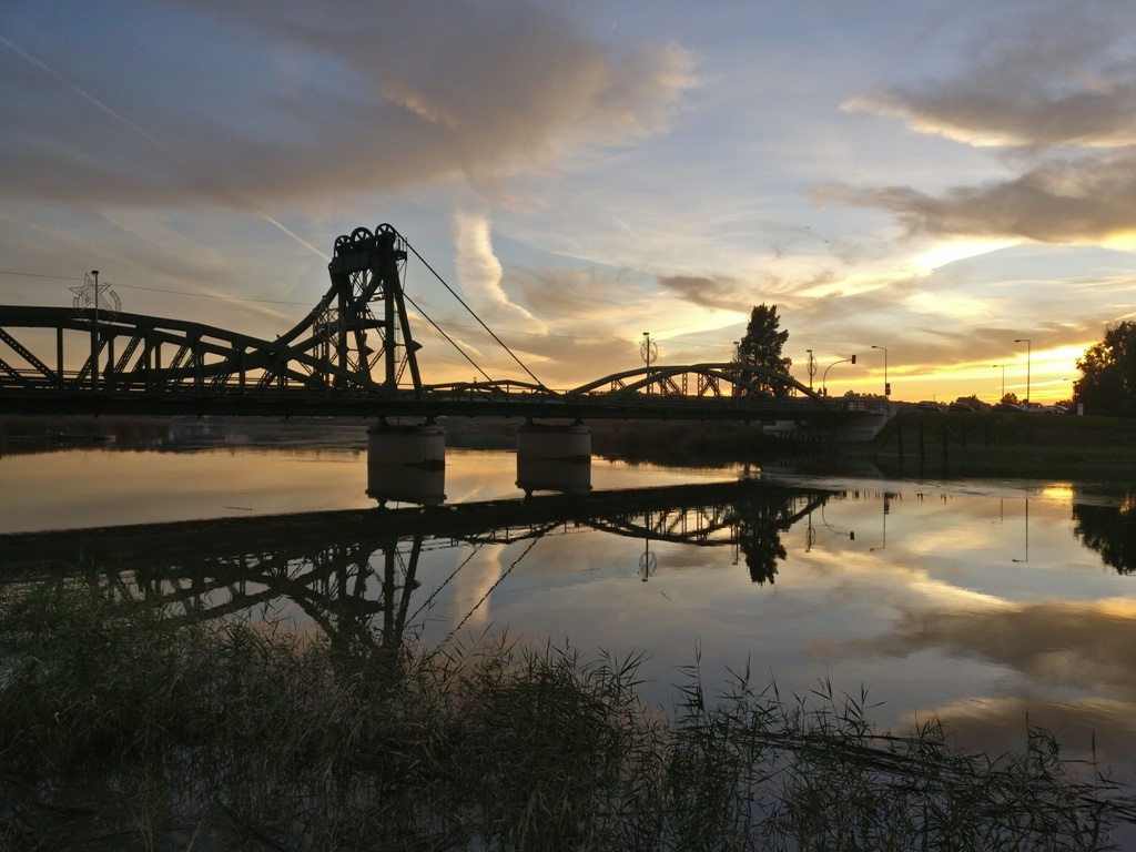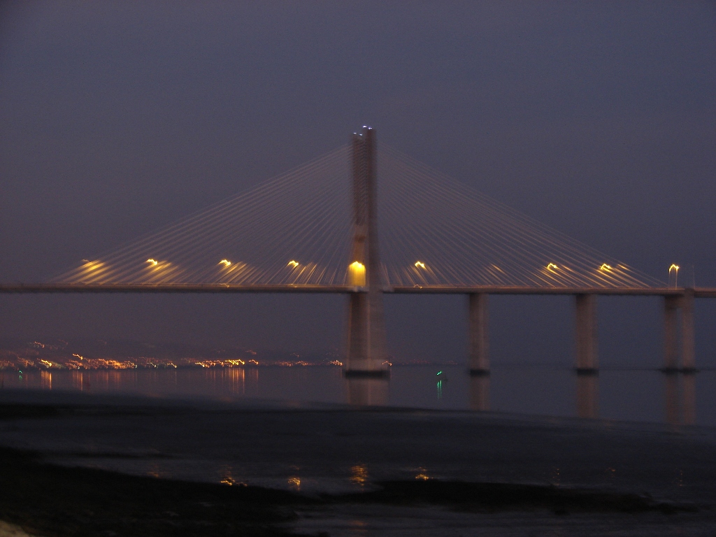 Crepúsculo com vista para a ponte pedonal sobre o rio Sado em Alcácer do Sal